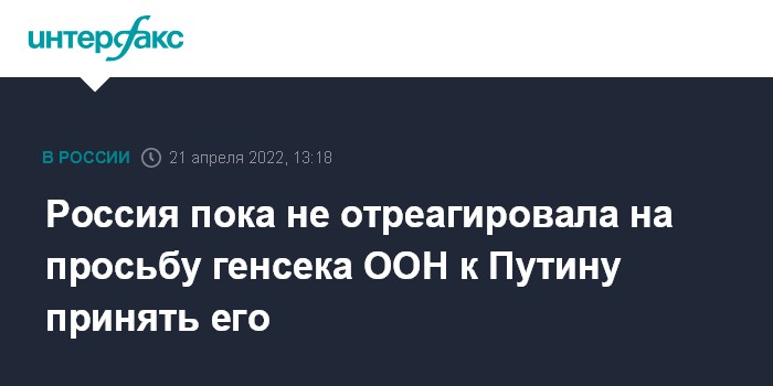Москва. 21 апреля. INTERFAX.RU - Россия пока не отреагировала на призыв генсека Антониу Гутерриша ООН к президенту РФ Владимиру Путину принять его в самое ближайшее время, сообщил пресс-секретарь главы российского государства Дмитрий Песков.