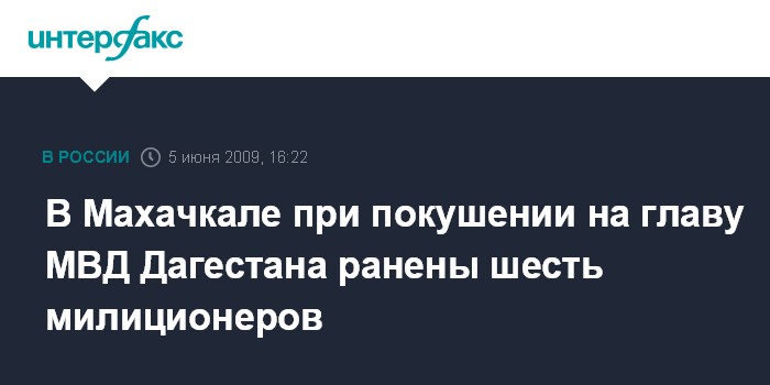 Москва. 5 июня. INTERFAX.RU - В пресс-службе УВД Махачкалы сообщили "Интерфаксу", что в больницы города в пятницу было доставлено восемь человек, раненых в результате покушении на министра внутренних дел Дагестана.