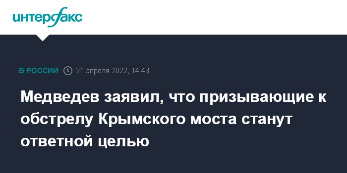 Москва. 21 апреля. INTERFAX.RU - Заместитель председателя Совета безопасности РФ Дмитрий Медведев предупредил, что киевские политики, призывающие к нанесению удара по Крымскому мосту, могут стать ответной целью.