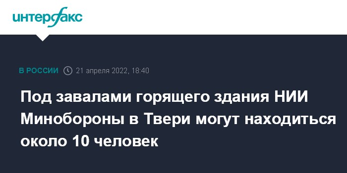 Москва. 21 апреля. INTERFAX.RU - Около десяти человек могут находиться под завалами из-за пожара в здании Центрального научно-исследовательского института Воздушно-космической обороны РФ в Твери, сообщил "Интерфаксу" информированный источник в четверг.