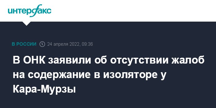 Москва. 24 апреля. INTERFAX.RU - Общественный деятель и журналист Владимир Кара-Мурза (признан в РФ физлицом-иноагентом), обвиняемый в распространении заведомо ложной информации о ВС РФ, не имеет жалоб на условия в изоляторе временного содержания. Об этом "Интерфаксу" сообщил ответственный секретарь Общественной наблюдательной комиссии (ОНК) Москвы Алексей Мельников.