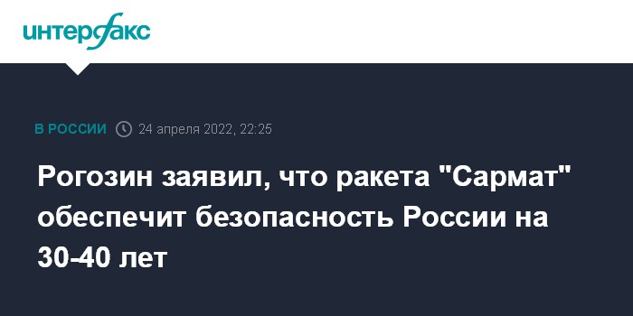 Москва. 24 апреля. INTERFAX.RU - Новая стратегическая ракета "Сармат" будет гарантировать безопасность России в ближайшие 30-40 лет, система противоракетной обороны (ПРО) США против неё бессильна, завил глава "Роскосмоса" Дмитрий Рогозин.