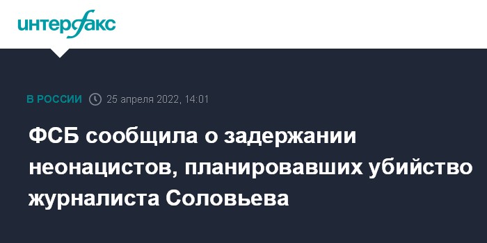 Москва. 25 апреля. INTERFAX.RU - ФСБ РФ сообщила о задержании участников запрещенной в России неонацистской группы, планировавших по заказу Службы безопасности Украины (СБУ) убийство журналиста Владимира Соловьева.