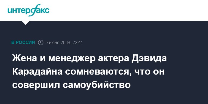 Вашингтон. 5 июня. ИНТЕРФАКС - Жена и менеджер известного голливудского актера Дэвида Карадайна высказали сомнения в том, что причиной его смерти стало самоубийство, сообщил в пятницу американский телеканал Си-Эн-Эн.