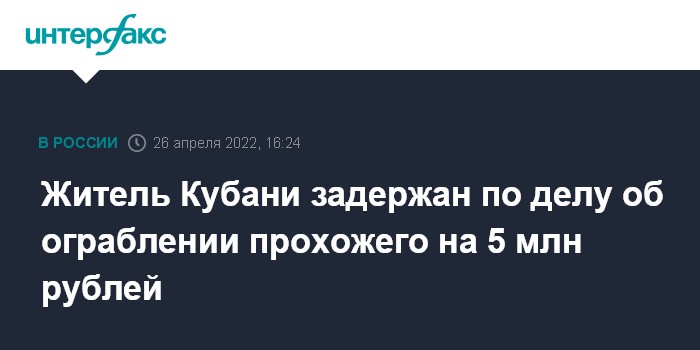 Житель Кубани задержан по делу об ограблении прохожего на 5 млн рублей