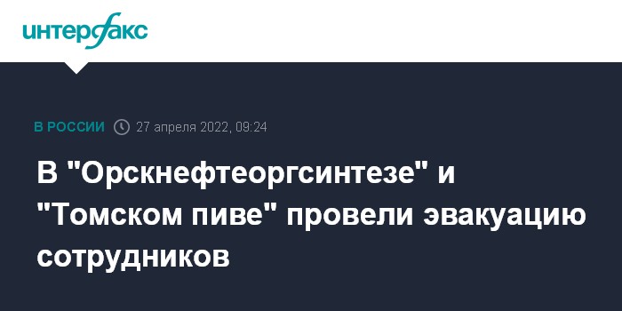 Москва. 27 апреля. INTERFAX.RU - В Оренбургской и Томской областях из-за сообщений о минировании в среду проводилась эвакуация сотрудников с заводов "Орскнефтеоргасинтез" и "Томское пиво",