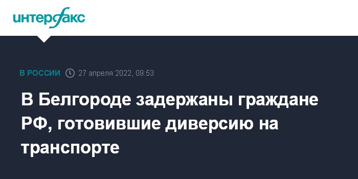 Москва. 27 апреля. INTERFAX.RU - Двое граждан РФ задержаны в Белгороде при подготовке к диверсии, также они передавали на Украину сведения о военнослужащих, принимающих участие в специальной военной операции, сообщает в среду Центр общественных связей (ЦОС) ФСБ.