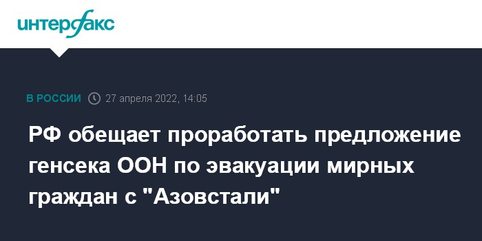 Накануне, 26 апреля, на сайте генсека ООН появилось сообщение, что Путин одобрил участие ООН совместно с "Красным Крестом" в эвакуации гражданских лиц с территории "Азовстали" в Мариуполе.
