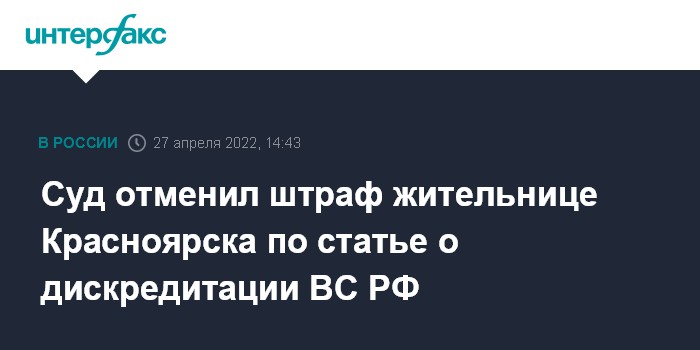 Москва. 27 апреля. INTERFAX.RU - Суд в Красноярске вынес решение об отмене штрафа местной жительнице за дискредитацию Вооруженных сил РФ, сообщает пресс-служба краевого суда.