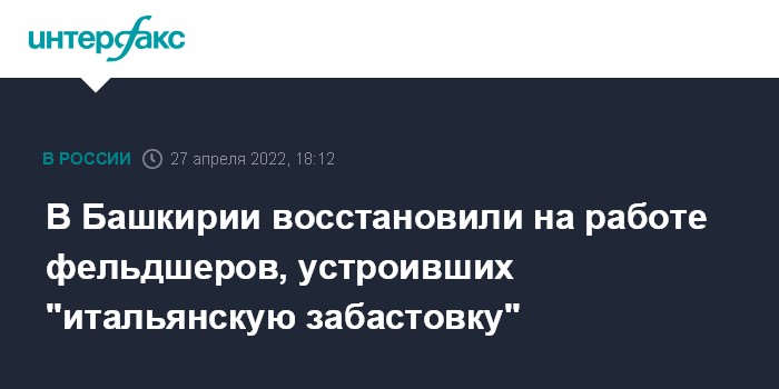 Москва. 27 апреля. INTERFAX.RU - Ишимбайский городской суд восстановил на работе трех фельдшеров службы скорой помощи Центральной районной больницы, уволенных после участия в "итальянской забастовке" в феврале 2022 года, сообщил "Интерфаксу" представитель суда.