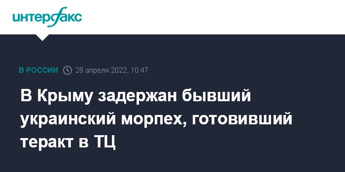 Москва. 28 апреля. INTERFAX.RU - ФСБ сообщает о задержании в Симферополе бывшего военнослужащего морской пехоты Украины, готовившего, по данным спецслужбы, поджог и взрыв в торговом центре.