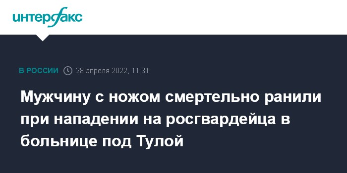 Москва. 28 апреля. INTERFAX.RU - Сотрудники правоохранительных органов применили оружие при попытке обезвредить мужчину с ножом в больнице под Тулой, сообщила в четверг пресс-служба регионального управления Росгвардии.