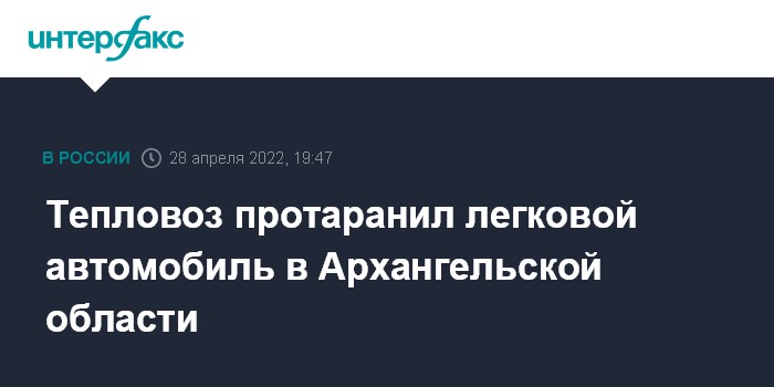 Москва. 28 апреля. INTERFAX.RU - Авария с участием легкового автомобиля и тепловоза произошла на нерегулируемом железнодорожном переезде по направлению в Северодвинск (Архангельская область) в четверг. Об этом сообщает пресс-служба Северо-Западной транспортной прокуратуры.