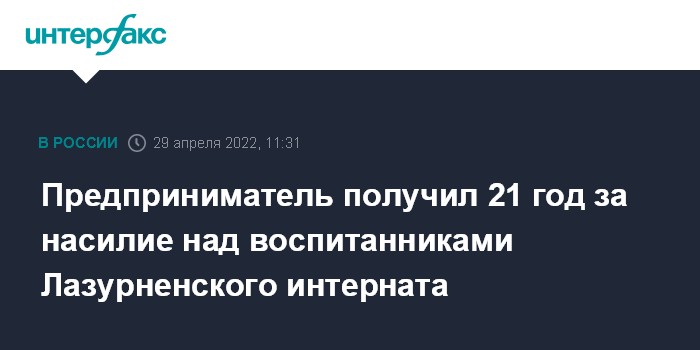 Москва. 29 апреля. INTERFAX.RU - В Челябинской области Красноармейский районный суд приговорил к 21 году колонии строгого режима обвиняемого в изнасиловании мальчиков-сирот из Лазурненской школы-интерната, сообщила "Интерфаксу" консультант суда Анна Леготина.