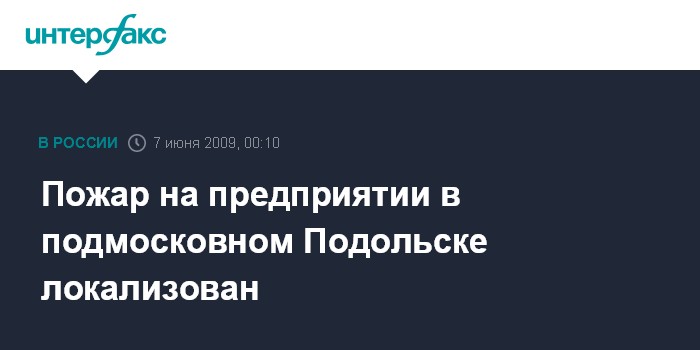 Москва. 7 мая. ИНТЕРФАКС-ЦЕНТР - Возгорание, возникшее ранее в субботу в складских помещениях на одном из предприятий подмосковного Подольска, локализовано.