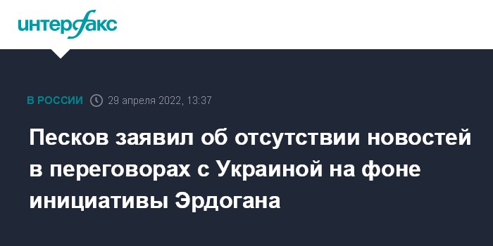 На просьбу журналистов прокомментировать реакцию Москвы на инициативу турецкого президента, предложившего повторно Стамбул в качестве переговорной площадки, пресс-секретарь президента РФ Дмитрий Песков ответил: "На переговорном треке новостей пока нет".