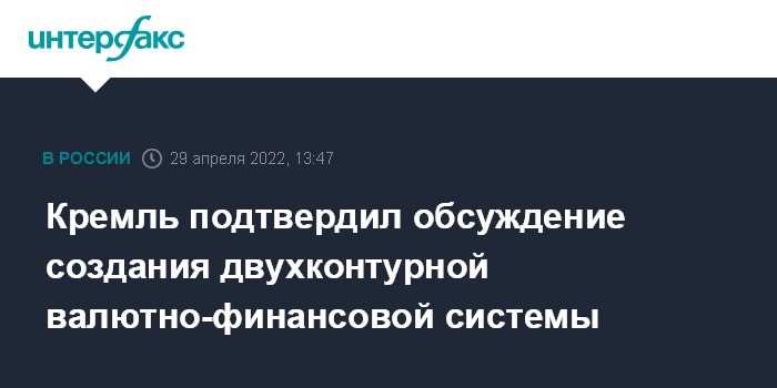 Москва. 29 апреля. INTERFAX.RU - Вопрос о создании в России двухконтурной валютно-финансовой системы находится в стадии обсуждения, заявил на брифинге пресс-секретарь президента Дмитрий Песков.
