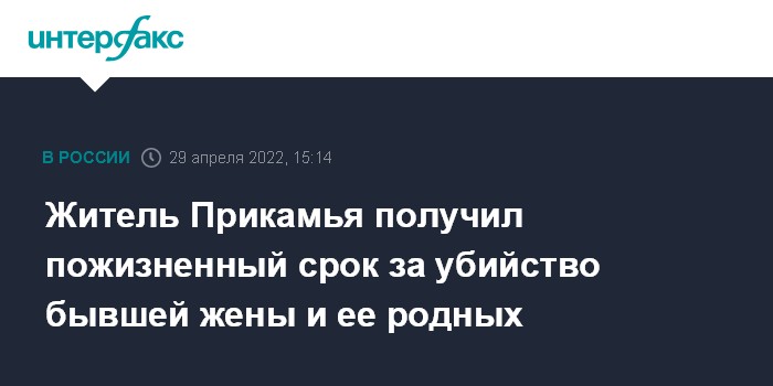 Москва. 29 апреля. INTERFAX.RU - Суд в Пермском крае назначил пожизненный срок лишения свободы местному жителю за убийство бывшей супруги и ее родственников, сообщается на сайте регионального СУ СКР в пятницу.