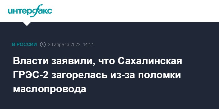 Москва. 30 апреля. INTERFAX.RU - Пожар на Сахалинской ГРЭС-2 произошел из-за повреждения маслопровода в турбинном отделении, сообщил в субботу губернатор региона Валерий Лимаренко на своей телеграм-странице.