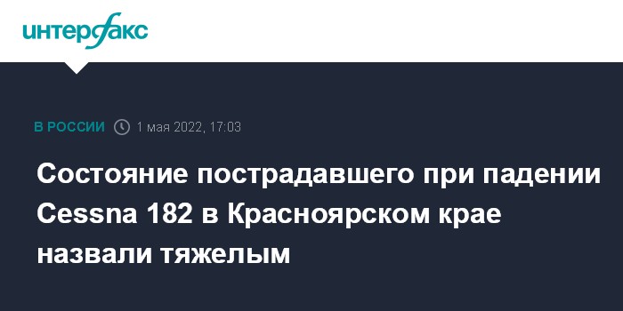 Москва. 1 мая. INTERFAX.RU - Состояние пострадавшего при падении легкомоторного самолета Cessna 182 в Красноярском крае оценивается как тяжелое, сообщили "Интерфаксу" в воскресенье в пресс-службе краевого министерства здравоохранения.