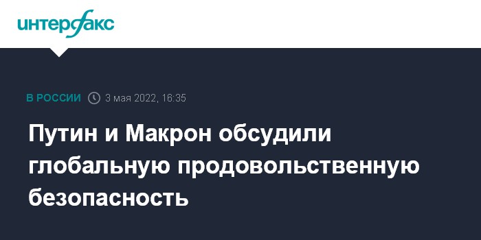 Москва. 3 мая. INTERFAX.RU - Одной из тем телефонного разговора президентов России и Франции Владимира Путина и Эммануэля Макрона стала глобальная продовольственная безопасность, сообщает во вторник пресс-служба Кремля.
