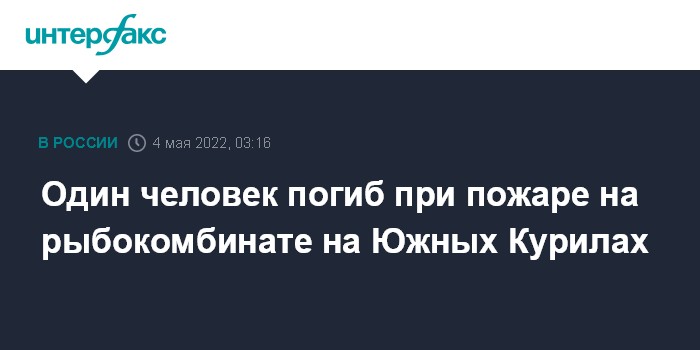 Москва. 4 мая. INTERFAX.RU - Пожар произошел на рыбокомбинате в Южно-Курильске (о. Кунашир, Южные Курилы Сахалинской области) в ночь на среду, сообщает пресс-служба ГУ МЧС региона. Следователи сообщают об одном погибшем.