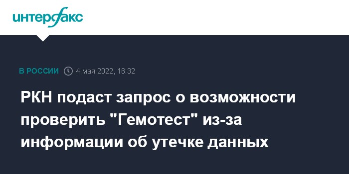 Москва. 4 мая. INTERFAX.RU - Роскомнадзор (РКН) требует от "Гемотеста" предоставить информацию о возможной утечке персональных данных клиентов лаборатории, а также обратится в прокуратуру с запросом о возможности проведения проверки организации, сообщили "Интерфаксу" в пресс-службе ведомства.