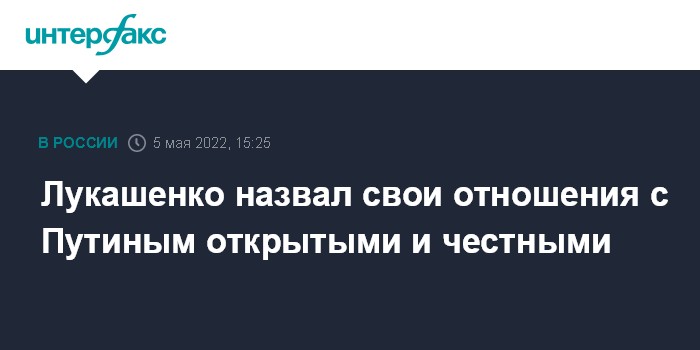 Москва. 5 мая. INTERFAX.RU - Президент Белоруссии Александр Лукашенко назвал очень близкими и честными свои отношения с президентом России Владимиром Путиным. Он сказал об этом в интервью АР. Беседа проходила в Минске.
