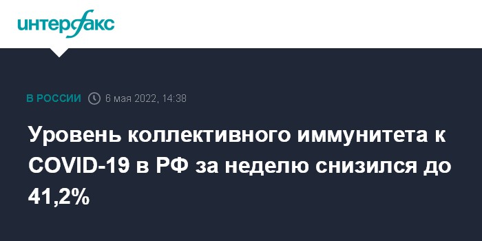 Уровень коллективного иммунитета в России составляет 41,2%, неделю назад он оценивался в 42,9%. Снижение коллективного иммунитета в стране отмечается 14 недель подряд.