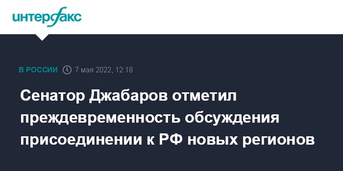 Москва. 7 мая. INTERFAX.RU - Говорить о возможности вхождения в состав России каких-либо новых регионов, в том числе Херсонской области, в настоящий момент преждевременно, считает первый замглавы Комитета Совета Федерации по международным делам Владимир Джабаров.