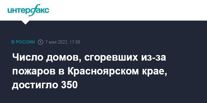 Москва. 7 мая. INTERFAX.RU - В населенных пунктах Красноярского края по причине замыканий на подстанциях и линиях электропередачи сгорело 350 домов, сообщает официальный телеграм-канал Рослесхоза в субботу.