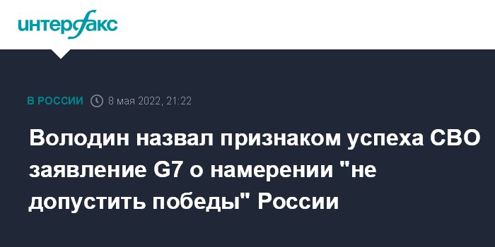 Москва. 8 мая. INTERFAX.RU - Заявление стран G7 о намерении "не допустить победы" России на Украине говорит о том, что они признают успехи специальной военной операции РФ, заявил председатель Госдумы Вячеслав Володин.