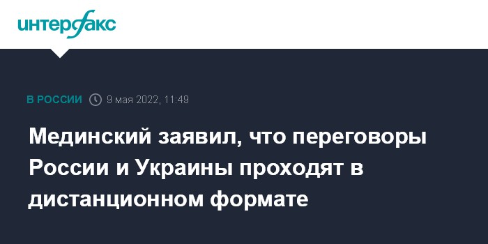 Москва. 9 мая. INTERFAX.RU - Переговоры между Россией и Украиной не прекращаются, они проходят в дистанционном формате, сообщил "Интерфаксу" помощник президента РФ Владимир Мединский.