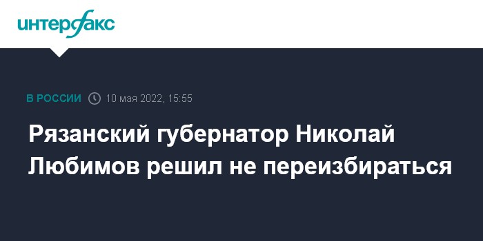 Москва. 10 мая. INTERFAX.RU - Губернатор Рязанской области Николай Любимов не будет выдвигаться на пост главы региона на следующий срок, он написал об этом на своей странице во "ВКонтакте".