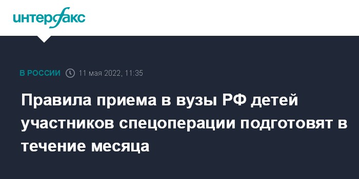 "В течение месяца Минобрнауки подготовит методические рекомендации по приему детей участников спецоперации в пределах квоты и направит их в вузы", - говорится в сообщении ведомства в среду.