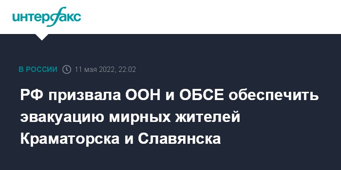 Москва. 11 мая. INTERFAX.RU - Российские военные призвали ООН, ОБСЕ, Красный Крест и другие международные организации обеспечить эвакуацию гражданского населения из городов Краматорск и Славянск (Донбасс), которые находятся под контролем вооруженных сил Украины.