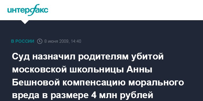 Москва. 8 июня. INTERFAX.RU - Родителям 15-летней московской школьницы Анны Бешновой, за убийство которой к 23 годам заключения приговорен гражданин Узбекистана, судом назначена компенсация морального вреда в размере 4 млн рублей.