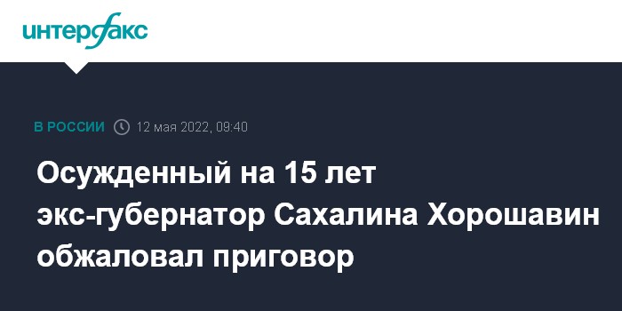 Москва. 12 мая. INTERFAX.RU - Экс-губернатор Сахалинский области Александр Хорошавин, приговоренный по двум уголовным делам по совокупности к 15 годам колонии строгого режима, обжаловал последнее решение Южно-Сахалинского городского суда, сообщил "Интерфаксу" в четверг его адвокат Евгений Балабас.