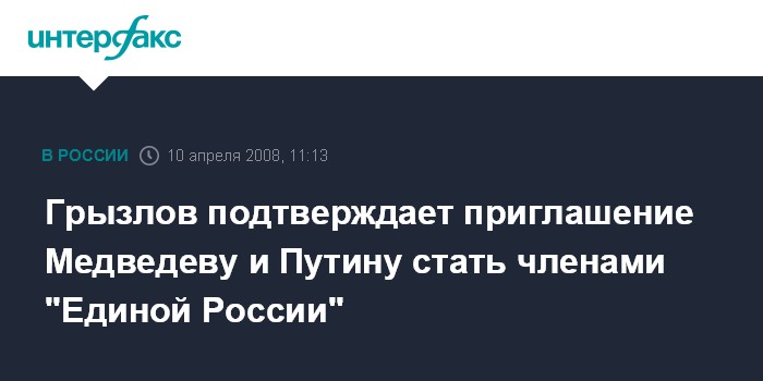Москва. 10 апреля. INTERFAX.RU - Лидер партии "Единая Россия" Борис Грызлов подтвердил, что "единороссы" были бы рады видеть в своих рядах ныне действующего и вновь избранного президентов - Владимира Путина и Дмитрия Медведева.