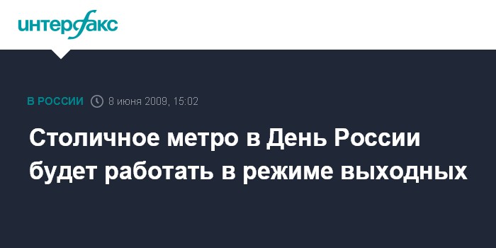 Москва. 8 июня. INTERFAX.RU – Московское метро в День России 12 июня будет работать в режиме выходного дня, сообщили "Интерфаксу" в понедельник в пресс-службе метрополитена.