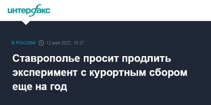 Москва. 12 мая. INTERFAX.RU - Ставропольский край, который с 2018 года участвует в эксперименте по взиманию курортного сбора, рассчитывает на его продление после 2022 года, сообщила пресс-служба губернатора региона Владимира Владимирова по итогам совещания под председательством вице-премьер РФ Дмитрия Чернышенко.