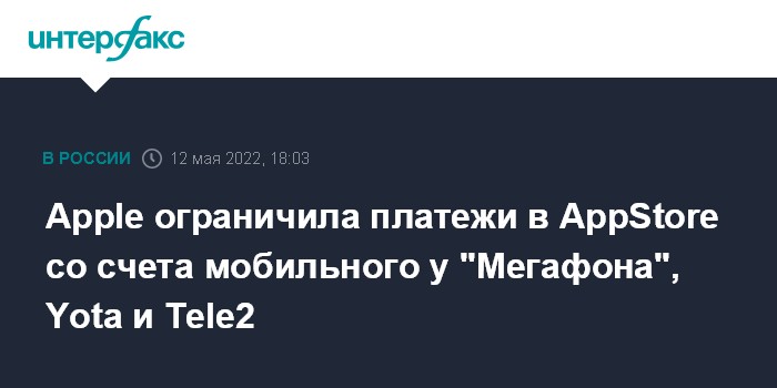Москва. 12 мая. INTERFAX.RU - "Мегафон", Yota и Tele2 фиксируют сложности с оплатой абонентами подписок и приложений в AppStore со счета мобильного телефона, сообщили "Интерфаксу" в компаниях.