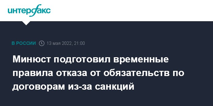 Москва. 13 мая. INTERFAX.RU - Минюст предложил установить на 2022 год временный порядок прекращения обязательств по сделкам, исполнение которых оказалось невозможным из-за санкций.