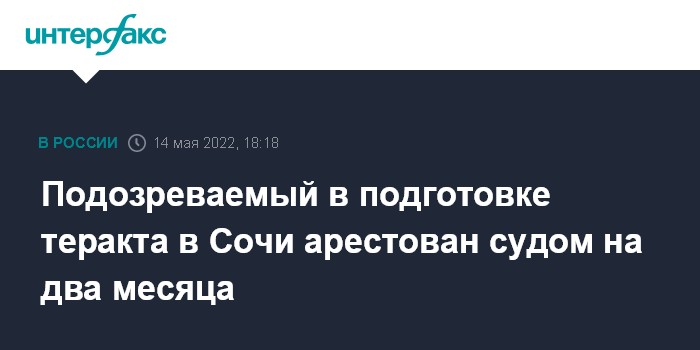 Москва. 14 мая. INTERFAX.RU - Центральный райсуд Сочи избрал меру пресечения в виде ареста мужчине, подозреваемому в подготовке вооруженного нападения в одном из торгово-развлекательных центров Сочи 9 мая, сообщает в субботу объединенная пресс-служба судов Краснодарского края.