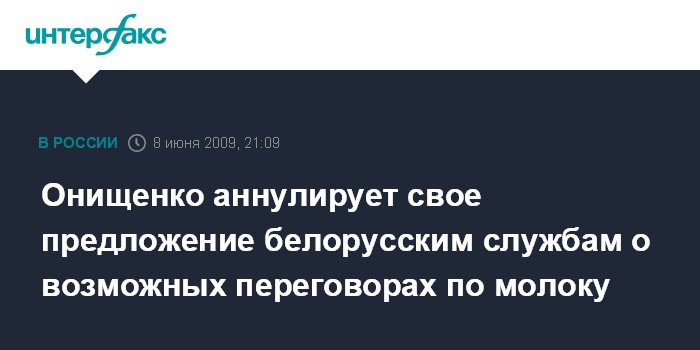 Москва. 8 июня. INTERFAX.RU - Руководитель Роспотребнадзора, главный государственный санитарный врач РФ Геннадий Онищенко заявил, что аннулирует свое ранее высказанное предложение белорусским структурам о возможных переговорах по вопросу о возобновлении поставок молочной продукции из Белоруссии в РФ.