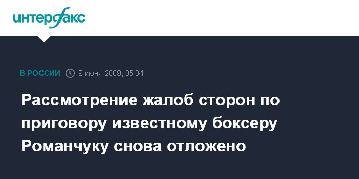 Владивосток. 9 июня. ИНТЕРФАКС - ДАЛЬНИЙ ВОСТОК - Приморский краевой суд отложил на неопределенный срок рассмотрение жалоб на приговор, вынесенный ранее известному российскому боксеру Роману Романчуку, которого обвиняли в убийстве жителя Владивостока.