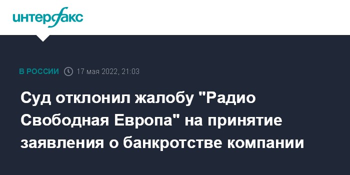 Москва. 17 мая. INTERFAX.RU - Девятый арбитражный апелляционный суд во вторник отклонил жалобу ООО "Радио Свободная Европа/Радио Свобода" (признано в РФ СМИ-иноагентом) на принятие к производству заявления инспекции Федеральной налоговой службы (ИФНС) №7 по Москве о признании компании банкротом.