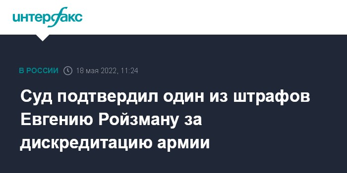 29 марта и 7 апреля Октябрьский суд Екатеринбурга назначил Ройзману три штрафа по 50 рублей каждый, признав его виновным по ч.1 ст.20.3.3 КоАП (публичные действия, направленные на дискредитацию использования Вооруженных сил России). Поводом для претензий к политику стали его пост размещение ссылки в соцсети, а также видеозапись на одном из популярных сервисов.