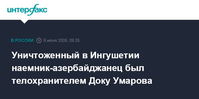Москва. 9 июня. INTERFAX.RU - Наемник из Азербайджана, уничтоженный в мае нынешнего года в районе селения Нижний Алкун Сунженского района (республика Ингушетия), являлся телохранителем Доку Умарова, сообщил агентству "Интерфакс-Юг" во вторник президент Ингушетии Юнус-Бек Евкуров. Он рассказал, что, согласно полученной оперативной информации, в районе селения Нижний Алкун, где боевики попытались захватить местных жителей, а также убили нескольких охотников, во время проведения спецоперации был уничтожен личный телохранитель главаря незаконных вооруженных формирований Доку Умарова. В автомашине были найдены сгоревшие останки еще двоих человек, обнаружены следы крови. Известно, что двоих раненых боевики унесли с собой.