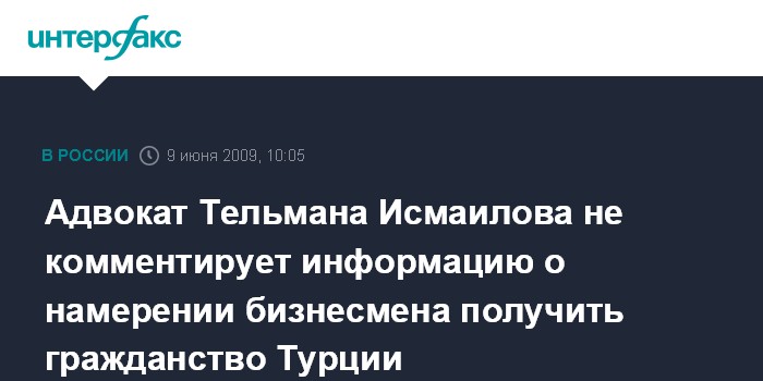 Москва. 9 июня. INTERFAX.RU - Адвокат российского предпринимателя Тельмана Исмаилова Павел Астахов не подтвердил, но и не опроверг сведения о намерении его доверителя получить турецкое гражданство. При этом он добавил, что Исмаилов не является госслужащим, и получение второго или третьего гражданства, по российским законам, не является нарушением.
